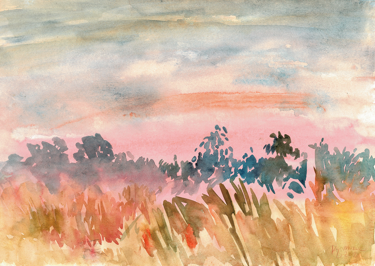Namalowana w plenerze na Polickich Łąkach, moim ukochanym miejscu. Jest to wyspa oddzielona rzeką Łarpią od mojego rodzinnego miasta, Polic. Czas płynie tu wolniej, a krajobraz tworzą podmokłe łąki, próchniejące drzewa i pasące się krowy.